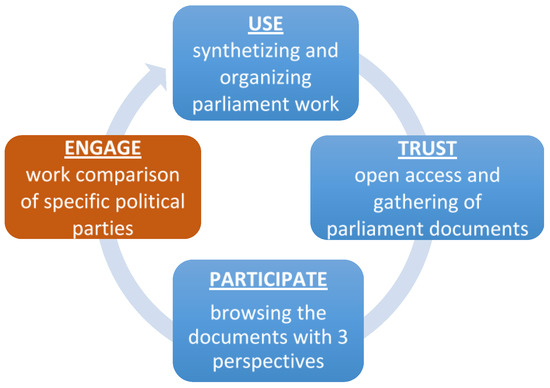 Preliminary feedback received on the prototype implementation by members of political parties, journalists and citizens indicates a strong interest in the approach, as it provides both a bird’s eye vision of the parliament work, and allows the comparison of specific parties and MPs, therefore improving transparency of the parliamentary work. Accessing this data is a first step for citizen in the engagement lifecycle. Indeed, being able to easily access and browse documents will help citizens by reducing their effort in analysing existing information.