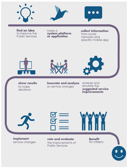 The proposed work develops an innovative approach to reinvent public services to support modernization. Technically it aims at a framework service to enable stakeholder-led innovation in public services. Its major strength is that it can be used across all public services, both electronic (e-government, mobile-government) and non-electronic. Figure 1 presents our approach, where we start by proposing services at different levels: citizen, public authorities and city. These services offer citizens a simple way of being informed, on the one hand, and to participate and thus civically being engaged, on the other.