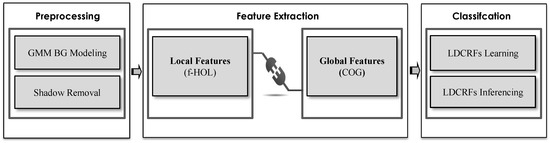 In this section, the proposed approach for video-based action recognition is described. A step-by-step overview of the proposed methodology is presented in Figure 1. As schematically illustrated in the above figure, the general framework of our proposed approach proceeds as follows. The first step consists in separating moving objects (i.e., human body parts) from the background in a given video sequence. Adaptive background subtraction is most appropriate to achieve this goal of motion detection. The segmented body parts can further be refined by standard morphological operations, such as erosion and dilation. Then, a set of low dimensional local features is extracted from the silhouettes of moving objects. Finally, a 3D vector representation is formed from the extracted features and then fed into an LDCRF classifier for action classification. The details of each part of the proposed technique are described in the remainder of this section.