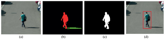 An example of shadow and motion detection in a real outdoor video: (a) an input frame; (b) subtracted background and detected shadow, where foreground pixels are marked in red color, whereas shadow pixels are marked in green color; (c) silhouette after removing shadow; and (d) moving object detection.