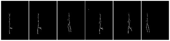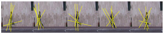 Figure 3 shows a sample sequence of skeleton images for a video sequence of a running action. Once binary skeletons of a given action video have been obtained, the probabilistic Hough transform algorithm described in [33] can be employed to detect straight-lines in each frame of the action video. An example of straight-line detection in a video of running action is given in Figure 4. It would be worthy of note at this point that our designed function for line detection is not as expensive as other traditional OpenCV Hough detectors.