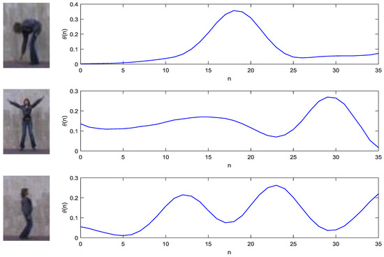 A sample of three actions along with their corresponding smoothed f-HOL features; from top to bottom, the actions are “Bend”, “Jack”, and “Jump”, respectively.