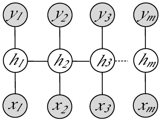 Graphical representation of the Latent-Dynamic Conditional Random Fields (LDCRFs) model. represents the j-th observation, denotes the hidden state assigned to , and is the class label of . The nodes in gray circles represent the observed variables.
