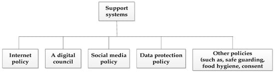 The school also has support systems for interaction, communication, and participation activities including an Internet policy, a digital council, social media policy, data protection policy, and other policies, such as food hygiene, safeguarding, and consent policies. Figure 3 shows the support systems in this school.