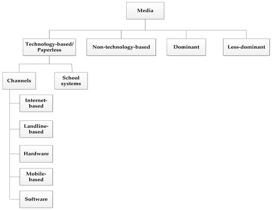 Furthermore, the school uses various media for participation activities between all stakeholders, as shown in Figure 2. The first medium is technology-based/paperless, which can be classified into channels and school systems. The channels include (a) Internet-based, such as e-mail, websites, YouTube, Facebook, Twitter, virtual learning environment; and a weekly newsletter delivered electronically; (b) landline-based, such as telephone; (c) hardware, such as PC and iPad; (d) mobile-based, such as mobile phones, iPads, and text message. Furthermore, the school system consists of pastoral care, staff, parents, pupils, and governors. The second one is non-technology/paper-based; for instance, the school produces a school magazine, letters, a parent forum, face-to-face meetings, a school diary, an alumni magazine, and a prospectus. The third is dominant media, such as a weekly electronic newsletter, the school website, school diary, and e-mails. The fourth is less dominant media, such as social media. E-mail is included in the first and third categories as it is a technology that has dominant influence or is used by many stakeholders in this school.