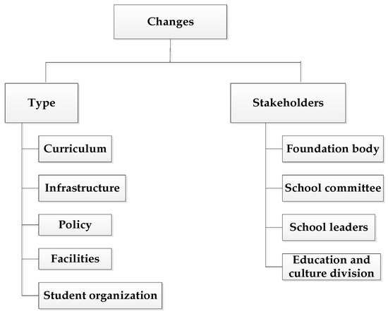The school also has some change factors, such as previously alumni only used mobile phones and face-to-face meetings and they now use Facebook and WhatsApp. We categorized those changes into types and stakeholders. The types of changes consist of curriculum, infrastructure, policy, facilities, and student organization. Additionally, stakeholders of change are the foundation, school committee, school leaders, and Ministry of Education and Culture. Figure 13 below shows the changes in this private school.