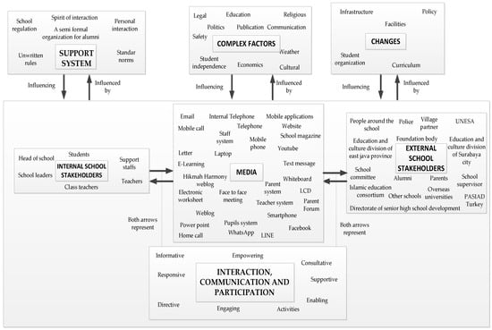 Furthermore, we developed a model of participation in Surabaya school based on the above results and made connections between those elements as actors, actants, and networks, as shown in Figure 14. Internal school stakeholders in Surabaya school have various interaction, communication, and participation activities with external school stakeholders through numerous media. Those processes influence and are influenced by several support systems, complex and change factors. Additionally, details of each element can be seen in the box.