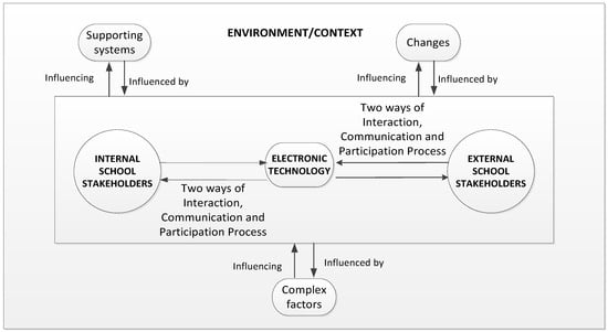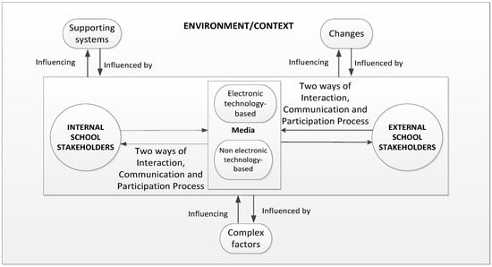 Based on the results above, we developed a model that describes the connection between those elements (actors, actants, and networks), as shown in Figure 7 below. Internal school stakeholders in Surabaya school have two various interaction, communication, and participation activities with external school stakeholders through numerous media. Those processes influence and are influenced by several support systems and complex change factors. The details of each element can be seen in the box.