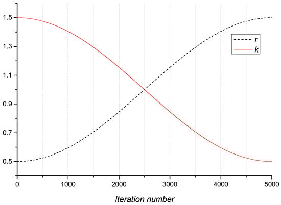 where the local dynamic regulation operator is , the global dynamic regulation operator is , i is the current iteration number, and MFE is the maximum iteration number. The r and k should satisfy the equation . As the MFE is 5000, the evolution curves of r and k was shown in Figure 1. The x axis is the iteration number of the algorithm, and the y axis is the values of local regulation operator k and global regulation operator r calculated by the upper equations.