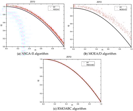 Plots of the non-dominated front found by the three algorithms for 2-objective ZDT2 test instance. (a) NSGA-II algorithm; (b) MOEA/D algorithm; (c) RMOABC algorithm.
