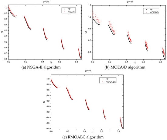 Plots of the non-dominated front found by the three algorithms for 2-objective ZDT3 test instance. (a) NSGA-II algorithm; (b) MOEA/D algorithm; (c) RMOABC algorithm.