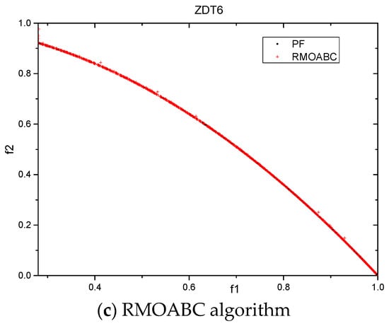 Plots of the non-dominated front found by the three algorithms for 2-objective ZDT6 test instance. (a) NSGA-II algorithm; (b) MOEA/D algorithm; (c) RMOABC algorithm.