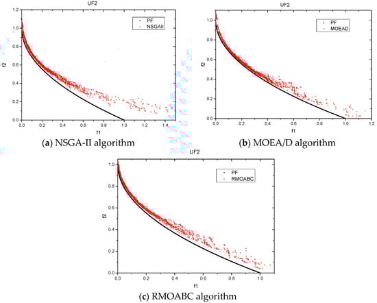 Plots of the non-dominated front found by the three algorithms for 2-objective UF2 test instance. (a) NSGA-II algorithm; (b) MOEA/D algorithm; (c) RMOABC algorithm.