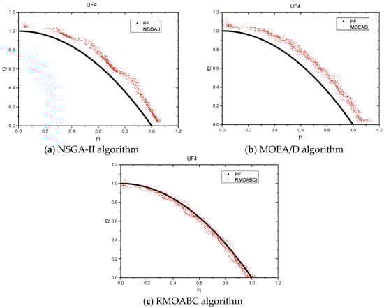 Plots of the non-dominated front found by the three algorithms for 2-objective UF4 test instance. (a) NSGA-II algorithm; (b) MOEA/D algorithm; (c) RMOABC algorithm.