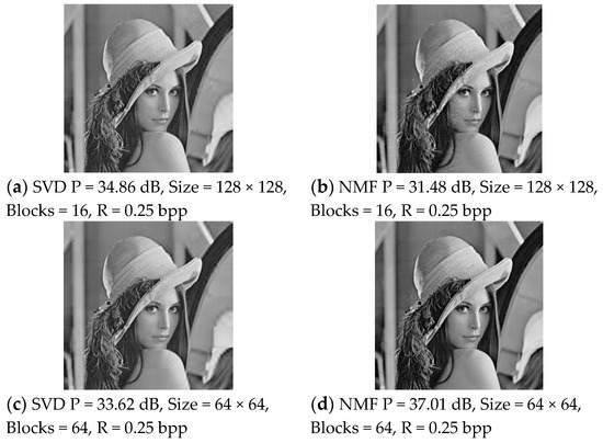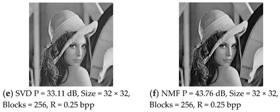 Figure 1 shows that we can do a simulation experiment by taking the block method based on the SVD and the NMF in this paper respectively on a 512 × 512 × 8 bit Lena image. Results show that the NMF method has a considerable advantage when the compression ratio is consistent with the SVD method. While noting that the more blocks and the smaller the size of the images, the more artifacts and edge effects the SVD method has. This results in lower image restoration quality, which can be seen from the P (Peak Signal to Noise Ratio, PSNR) with S (Size), B (Block number) and R (Compression ratio) data.