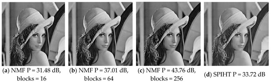 Moreover, we undertake a simulation experiment between the NMF method and the SPIHT method. The SPIHT algorithm is a fast and effective technique for image compression. It is spatial tree-based and exploits magnitude correlation across bands of the decomposition [20]. Also, the SPIHT method possesses a lower computational complexity than the NMF method. Based on the above points, the SPIHT method has been selected for the contrast experiment.