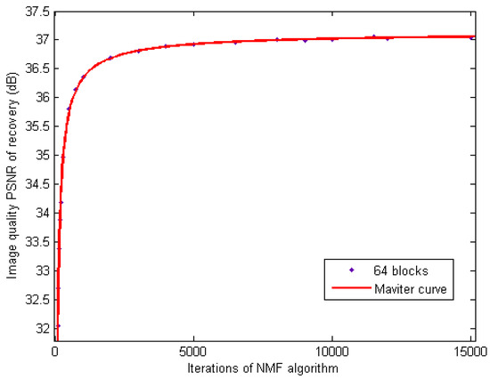 Fitting curve of iterations and Peak Signal to Noise Ratio (PSNR) with 64 blocks.