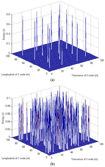 512 × 512 × 8 bit grayscale images are collected by camera nodes periodically. We adopt compression ratio for simulation. When calculating the energy consumption, parameters of Equation (19) are set as follows: