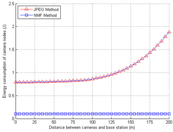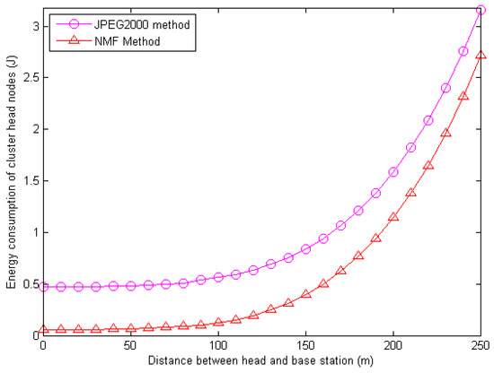 Figure 6 shows the energy consumption of the cluster head node using the JPEG2000 method [21] and the NMF method.