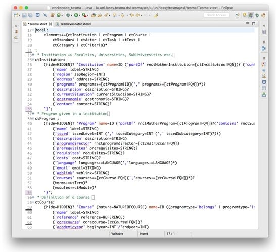 - Bettini, L. Implementing Domain-Specific Languages with Xtext and Xtend, 1st ed.; Packt Publishing, Incorporated: Birmingham, UK, 2013. [Google Scholar]