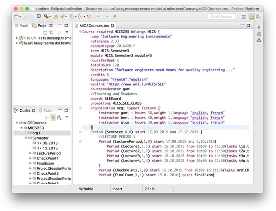 - Guelfi, N.; Jahić, B.; Ries, B. TESMA: Towards the Development of a Tool for Specification, Management and Assessment of Teaching Programs. In Proceedings of the 2nd International Conference on Applications in Information Technology, Balikpapan, Indonesia, 26–27 October 2016; pp. 5–8.