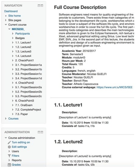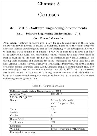 - Jahić, B. Requirements, Design and Implementation of a Teaching Specification, Management and Assessment tool. In Laboratory for Advanced Software Systems Technical Report TR-LASSY-16-03; University of Luxembourg: Luxembourg, 2016. [Google Scholar]