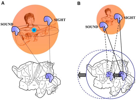 Multisensory integration could be evaluated in terms of antipodal points and BUT. Figure 1B depicts an example of multisensory integration in the BUT framework. Consider an observer who hears the strumming of a guitar standing in the surrounding environment. A guitar player is embedded in the environment. The observer perceives, through his different sense organs such as ears and eyes, the sounds and the movements produced by the guitar player. According to the BUT dictates, the guitar player stands for an object embedded in a three-dimensional sphere. The two different sensory modalities produced by the guitar player (sounds and movements) stand for the antipodal points on the sphere’s surface. Objects belonging to antipodal regions can either be different or similar, depending on the features of objects []; however, the two antipodal points share the same features. Both sounds and movements come indeed from the same object embedded in the sphere, i.e., the guitar player. The two antipodal points are not true points, but instead shapes, or functions, which can also be portrayed as vectors containing all the features of the stimulus: in the case, for example, of the visual inputs, the vector contains information about the colours, the shape, the movements of the guitar player. The two antipodal points project at first to a two-dimensional layer, the brain cortex—where multisensory neurons lie—, then are integrated into a single multimodal signal, which takes into account the features of both. Cerebral hemispheres can be indeed unfolded and flattened into a two-dimensional reconstruction by computerized procedures []. We may think to a single vector, embedded in the two-dimensional brain, which contains the features of all the information from the two inputs.