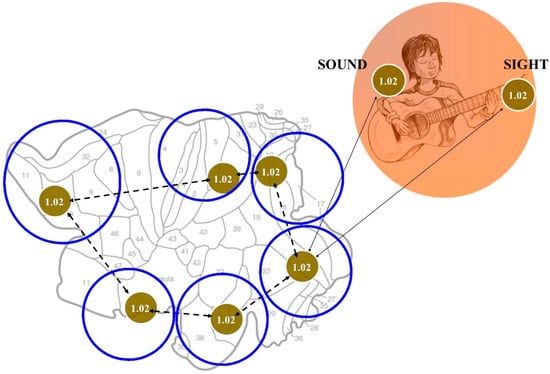The use of BUT in the evaluation of brain computations during multisensory integration. The figure displays a hypothetical case for illustrative purposes. The red circles are equipped with a number standing for the corresponding entropy value (in this hypothetical case: 1.02). The right Figure displays the environment containing two cues with matching description, e.g., equipped with entropy values: 1.02. The same entropy value can be found in the corresponding multisensory neuronal assembly located in the brain sensory cortex (left figure). This means that there must be at least a cortical area (or micro-area) with the same entropy value of the two matching points encompassed in the environment. Because multisensory interactions occur at all temporal and spatial stages, their extensive cortical connections must have something in common: they must display the same values of entropy (in this case, 1.02). This allows us to recognize which zones of the brain are functionally correlated during multisensory integration.