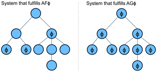 In contrast to LTL, CTL allows for creating statements about states of trees. Therefore, besides logical operators, CTL provides a set of temporal connectives. Each temporal connective is a pair of symbols. The first symbol specifies the path quantifier, which is either A (along All paths) or E (there Exists at least one path). The second symbol stands for a set of temporal operators, namely X (at the neXt state), F (at a Future state) and G (at all future states, i.e., Globally). The combination of these two symbols defines the most important operators (EX, EF, EG, AX AF and AG) to specify properties that take into account the non-deterministic behavior of a system. Consider the following property: “It is always possible to reach a safe state”. This may be expressed in CTL with the formula AF(EG(safe(s))). Figure 1 shows two example systems that fulfill or , respectively.