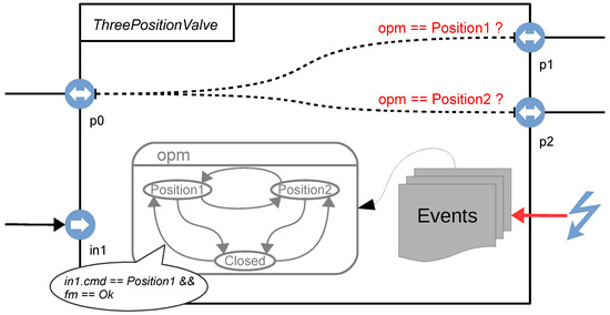 - B describes the state-dependent behavior of a component. The state-dependent behavior is described in terms of modifications to connection structure and also by adding properties to ports. Actually, properties are key-value pairs that provide a quite flexible mechanism to abstract from physical flow information. During simulation, properties are propagated through the connection structure. There are two types of connections: undirected channels for physical links and unidirectional channels for logical signals. Built-in primitives enable flow direction determination. The information about flow direction is available at each port by means of a reserved property (e.g., flow.dir = In).
