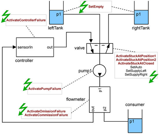 Figure 4 shows a very simple example system. The system consists of two tanks (leftTank, rightTank), a consumer which is modeled as a tank, a three-position valve, a flow meter, a pump, and a controller. The controller is responsible for keeping the consumer always supplied with liquid. In the case of an empty tank failure, the controller receives a zero-flow-message from the flow meter and solves the problem by sending a position change command to the valve. The valve can be controlled either by command or manually, using the external events SetSupplyLeft, SetSupplyRight, and SetAuto.