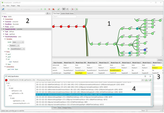 We have developed a tool that integrates the algorithms and provides an intuitive user interface for simulation tasks. Figure 5 shows our tool after simulation of the Two-Tank-Pump-Consumer system. The tree graph (1) visualizes the simulation result. Stable states (turquoise nodes), references to other nodes (blue nodes), and event transitions (bold lines) are highlighted to get a clear understanding about the system behavior. A selected node can be inspected with our model tree view (2). In this view, state variable values, properties at ports, and information about connections can be displayed. Since often only certain variables are of interest, our tool provides a watchlist (3) indicating the changes of certain variables on a selected path. The dialog for verification of safety requirements (4) allows specification of CTL formulas and displays the counterexamples in case of a violation. In addition, counterexamples are visualized in the tree graph by highlighting the state nodes that are part of the trace.