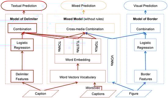 This section describes the architecture of assembling neural networks (NNs) (see Figure 2). Our system contains one cross-media mixed model without rules (Mixed Model) and two single-media models based on rules (Model of Delimiter and Model of Border). A Model of Delimiter is one textual rule model based on Delimiter Features and three deep learning methods of textual convolutional neural networks (TCNNs), textual long short-term memory networks (TLSTMs) and textual gated recurrent unit networks (TGRUs). A Model of Border is composed of Border Features and visual convolutional neural networks (VCNNs).