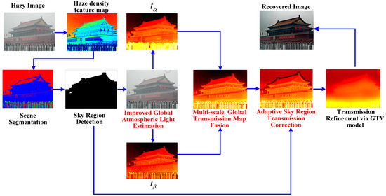 In this section, we propose a single image dehazing method aiming at overcoming the inherent limitations of DCP; the main procedures are illustrated in Figure 1. Inherently inspired by [16,22], we detect the sky region based on the haze density feature map and scene segmentation technique. Then, we apply three key steps, including the improved global atmospheric light estimation, the multi-scale transmission map fusion and the adaptive sky region transmission correction. Next, we introduce the guided total variation (GTV) to smooth the edge around the sky region and eliminate the extensive texture details in the transmission map. Finally, with the knowledge of global atmospheric light and the transmission map, the image can be recovered via the atmospheric scattering model.