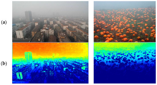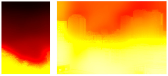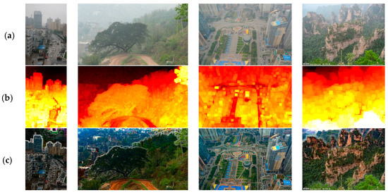 In Figure 2, Figure 2a shows two hazy images and Figure 2b demonstrates the corresponding haze density feature maps. In can be noticed that the obtained haze density feature map can precisely describe the spatial relationship of the haze density distribution and is well consistent with visual perception of haze density