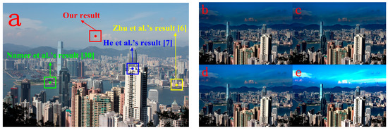 We further conduct experimental comparison to verify the influence of atmospheric light estimation. With the different atmospheric light estimation results that are obtained via [6,7,33] and our method, we obtain the transmission map using the same method (He et al.’s method [7]) for the sake of fairness and further get the recovered images via the atmospheric scattering model. The corresponding recovered images are demonstrated in Figure 6b–e, respectively. Through comparison, we can notice that Figure 6e has better visibility.
