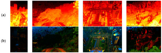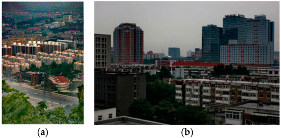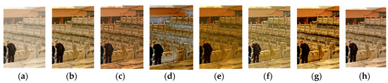 According to Table 3, our results yield the top value for Figure 14 and Figure 15. Although our results only achieve the third best value for Figure 16 and Figure 17, however, the result of can be increased when artificial edges become visible; for instance, Meng et al.’s results have the second highest value for Figure 16, whereas the most serious over-enhancement appears in the sky region of Figure 16c.