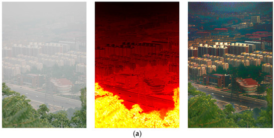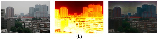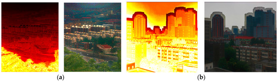 where is the refined transmission map, is the weight function and is the guidance image, which is defined as . According to [11], Equation (13) can be expressed and processed using an iteration form, and we have , and as the regularization parameters for the approximation term, the smoothing term and the edge-preserving term, respectively.