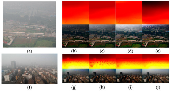 In this paper, we present a multi-scale fusion-based strategy, as well as an adaptive sky region transmission correction method to obtain the transmission map and introduce the GTV model to further refine the transmission map. However, to our best knowledge, many transmission estimation methods have been proposed and have made significant progress. In order to verify the advantages of our method, we conduct the experimental comparison with several state-of-the-art methods, including [12,21,26]. We choose two challenging hazy images (a dense haze image without sky region (Figure 13a) and a hazy image with sky region (Figure 13f) for the experimental comparison. The relevant comparison results are provided in Figure 13b–e and Figure 13g–j. As we can see from Figure 13, the transmission maps that are estimated using our method are more consistent with our intuition than those of [12,26] and are comparable to those of [21].