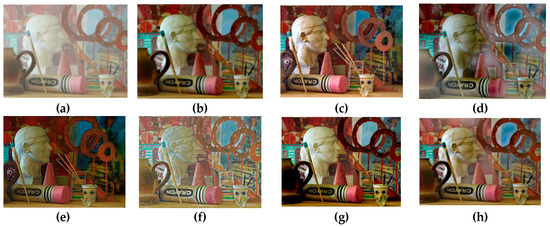 By adopting the image pyramid model [35], we decompose the transmission into low frequency component and the high frequency component . Similarly, the transmission is decomposed into low frequency component and the high frequency component . Then, considering that the pyramid model contains extensive accuracy low frequency component and the pyramid model consists of substantial accuracy high frequency component, the fusion strategy should be designed to support these important features; thus, the bottom level of should has the highest fusion weight, and the fusion weight should decrease along with the increased level index. Accordingly, the corresponding fusion weight for should be set oppositely. Therefore, we create the adaptive multi-scale transmission fusion method as:
