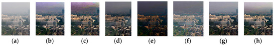 We compare our method with several state-of-the-art methods on four challenging hazy images, including a synthetic misty image (Figure 14a), a real-world dense haze image (Figure 15a), a real-world hazy image with a large sky region (Figure 16a) and a real-world hazy image with large white/gray regions (Figure 17a). In Figure 14, Figure 15, Figure 16 and Figure 17, The original hazy images are displayed in Column (a); in Columns (b)–(g), from left to right, we demonstrate the dehazing results correspond to He et al.’s [7], Meng et al.’s [9], Ancuti et al.’s [36], Yu et al.’s [25], Tarel et al.’s [10] and Choi et al.’s method [17] and our method, respectively.