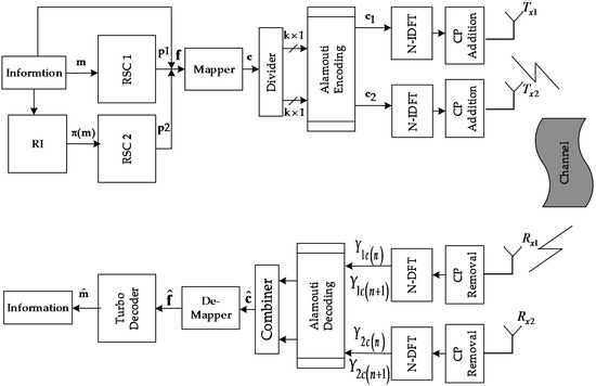 f are mapped into a mapper that generates digitally modulated complex symbols c, i.e., QPSK, 16 QAM etc. Then, Alamouti encoding [