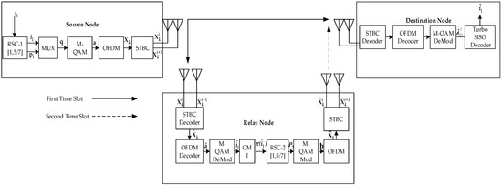 Figure 5. The scheme completes the transmission of one turbo coded OFDM frame in two time slots. The source-S node consists of 1/2 rate RSC-1 encoder, mapper, OFDM block and Alamouti STBC. The information sequence of bits