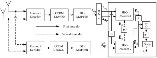 The received signals and are delivered to Alamouti STBC decoder and OFDM demodulator in their respected time slots. OFDM demodulator takes N-point DFT and removes the cyclic prefix to form the complex symbols. These complex symbols are digitally demodulated by SISO demodulator. SISO demodulator produces log likelihood ratios (LLRs) for each of the received coded bits. These soft bit LLRs for first and second time slot are given an input to joint iterative turbo decoder, which iterates for a desired number of iterations and pass the updated LLRs to the slicer. The term joint here refers to the fact the decoding of the signals and are performed together rather than decoding each of the received signal separately. The joint iterative turbo decoding for the proposed scheme is comprehensively discussed in the subsequent section of the manuscript. In the end the slicer performs the hard decoding operation on each received soft bit to recover the original transmitted sequence of information bits .