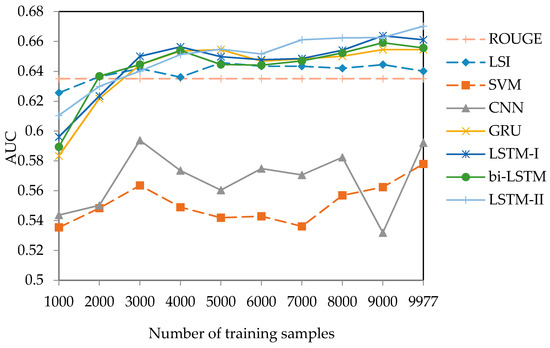 From Figure 4 we could find that GRU and LSTM-based methods were generally better than others with the change of the training set size, indicating the stability of the models. When the sample size was low (< 4000), we found that the curve of ROUGE, LSI, GRU, LSTM-I, and bi-LSTM could sometimes be higher than that of LSTM-II. However, with an increase in samples, LSTM-II performed beyond other methods. Furthermore, we also noticed that when the size of training samples was small (i.e., 1000 and 2000), LSI achieved the best result, which could be explained by the insufficient training of the deep neural networks. The deep models needed a large scale of training data so that the parameters could be fully learned. Therefore, a clear trend for GRU and LSTM-based methods was that the curves were increasing in a linear manner when adding more samples. Comparatively, SVM and LSI had worse results on the AUC curves and there seemed to be less regularities to them. This was particularly the case for LSI as, although it performed well with an increase in training set size, the curve started to decline when training used over 5000 samples. This indicated that LSI possibly might not be able to mine more valuable information through expanding the training scale. The trend of bi-LSTM was similar, and slightly worse, compared to LSTM-I, which meant that the bi-LSTM method could not improve the performance compared to LSTM-I on different sizes of training data. We thought that the possible reason might be a lack of the training data for bi-LSTM, as the number of parameters for bi-LSTM was double that of LSTM-I, or difficulty in optimization for bi-LSTM based on the same sized training data for the document–summary pair identifying tasks.