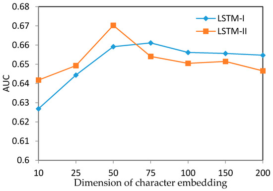 We further discussed the effects of character embeddings by using different dimensions as well as the performance of random embeddings (Figure 5). We only tested LSTM-I and LSTM-II with the dimension of character embedding ranging from 10 to 200 (small intervals at the beginning and large intervals later because we obtained the best result at dimension 50). It was noticed that the optimal AUC value was achieved when the dimension of the character embedding was 50, with the value decreasing drastically later. The curve of LSTM-I was similar to that of LSTM-II with an increase in embedding dimensions. However, when the information capacity of the character embedding as well as the dimension of LSTM units (we set the dimension of the LSTM units the same as the input character dimension in our models) was low (a low dimension, i.e., <50), we found that LSTM-II got better AUC values. To some extent, it validated the ability of LSTM-II in keeping long-term sequential information.