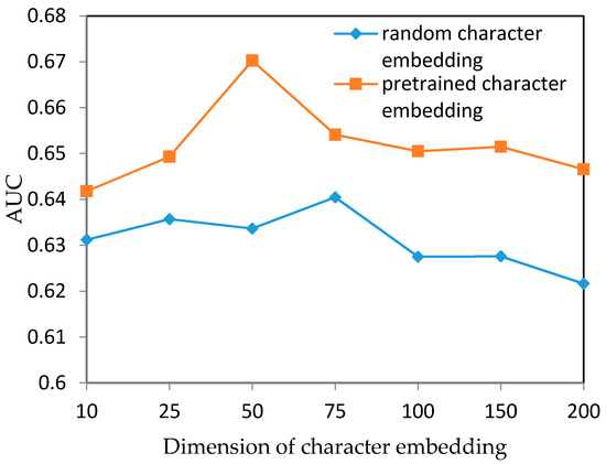 In the experiments, we used a pre-trained character embedding matrix which was trained on the raw data crawled from Sina Weibo. Since some studies found that using random embeddings as input could also generate good results [29], we tested the contribution of the pre-trained embeddings by comparing with LSTM-II with random input embeddings. We also tried different dimensions analogous to the above experiment, with the curves shown in Figure 6. It was clear to see that the model with pre-trained embeddings was better than that with random embeddings. Pre-training the embeddings was an operation to discover the data distributions on the corpus which was helpful for the model in searching optimal points. We believed that our model also benefits from the pre-trained character embeddings.