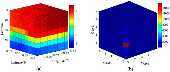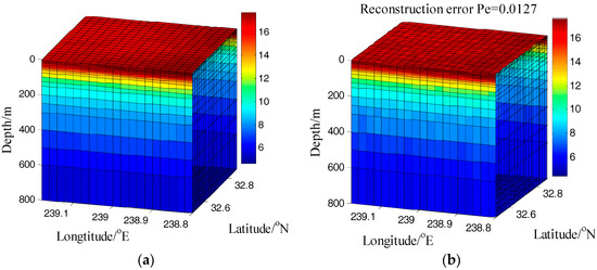 The original temperature and reconstruction data in three-dimensional underwater sensor networks (USNs). (a) The original data; (b) The reconstruction data.