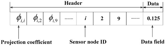The packet design is illustrated in Figure 3; the header field has two sections, a 1-bit slot for projection coefficient , and -bit slots for node ID. The data field is constructed by 64-bit slots, which stores the random projection values. There, two packets can be merged into one packet if they do not share any node ID and the length of header does not exceed its maximum length.