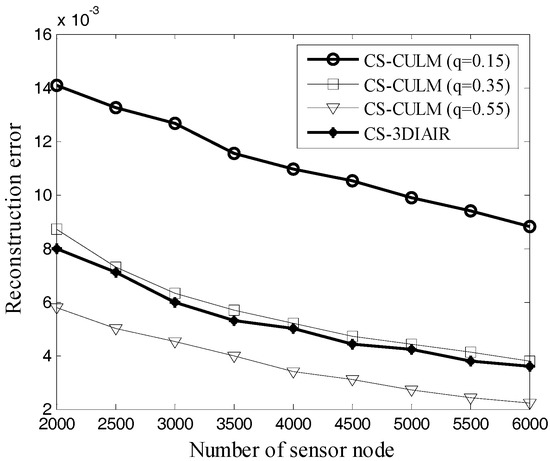 In Figure 6, the randomly deployed nodes n are used to recover 8000 original data x. Measurements received by the sink node increase with the increasing number of sensor nodes, so the reconstruction error of CS-CULM and CS-3DIAIR shows a downward tendency. The clustering algorithm unutilized in CS-3DIAIR results in a waste of energy, but its measurements M are more than CS-CULM (q = 0.15), which contributes to the precision of reconstructed data. While in CS-CULM, the rising probability q also causes the increase of measurements M; therefore, at the same number of nodes, the reconstruction error decreases. When the number of sensor nodes n = 2000, the probability of becoming a cluster head q = 0.15, and the reconstruction error of CS-CULM is .